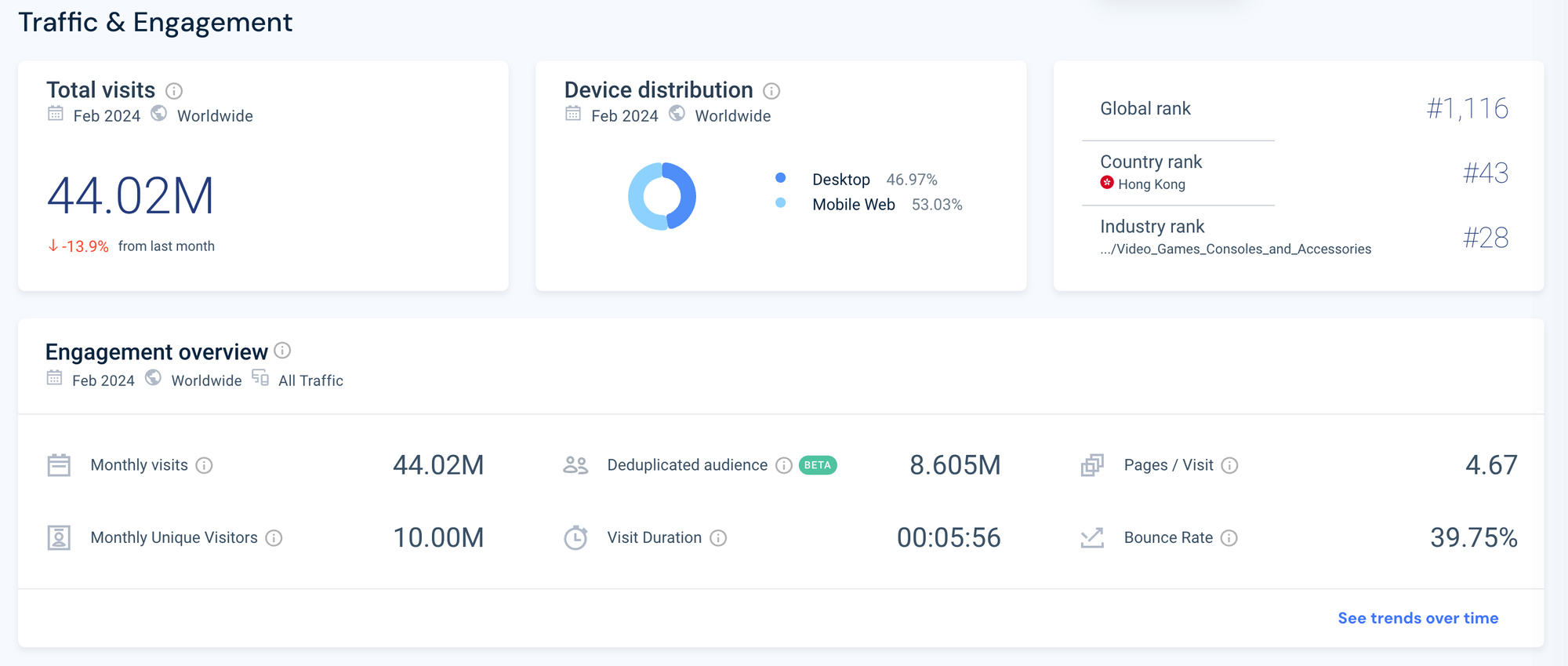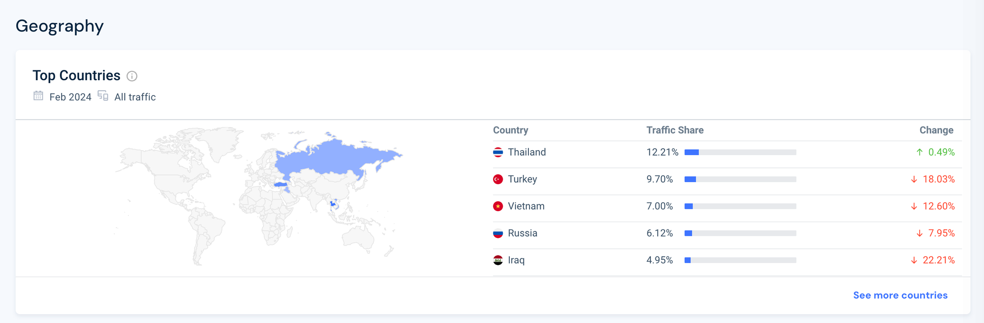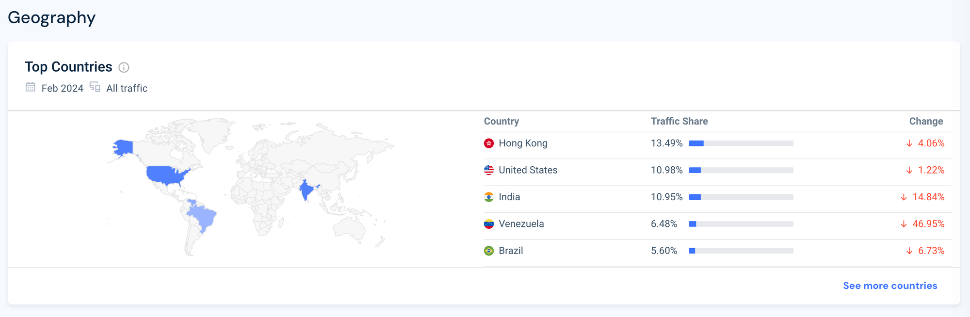 2024년 2월 기준, 홍콩 방문자의 비율이 가장 높았고, 그 뒤를 이어 미국과 인도의 방문 비중이 높았다. 또한 베네수엘라와 브라질과 같은 남미 지역에서의 유입률이 높게 나타났다.