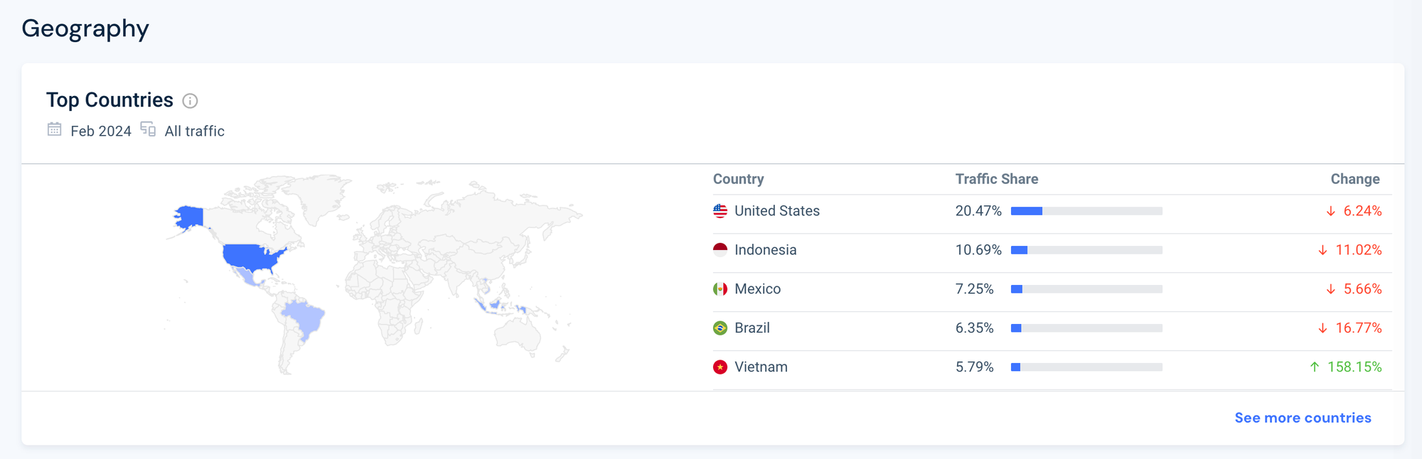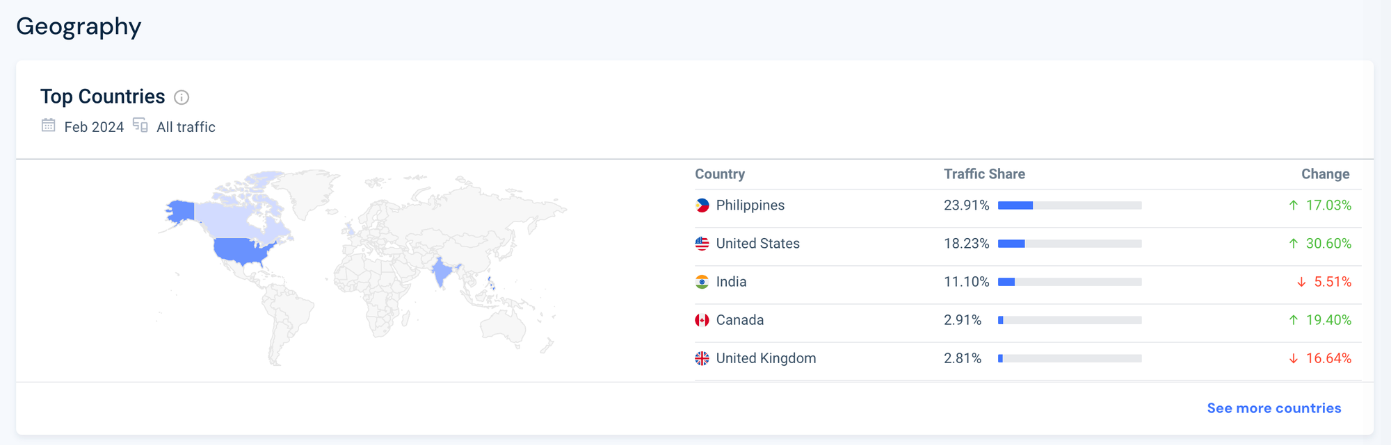 2024년 2월을 기준으로 영어권 국가의 사용자 비율이 가장 높고, 그 중에서도 필리핀 사용자들의 방문 횟수가 가장 많았다.