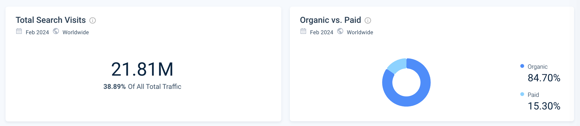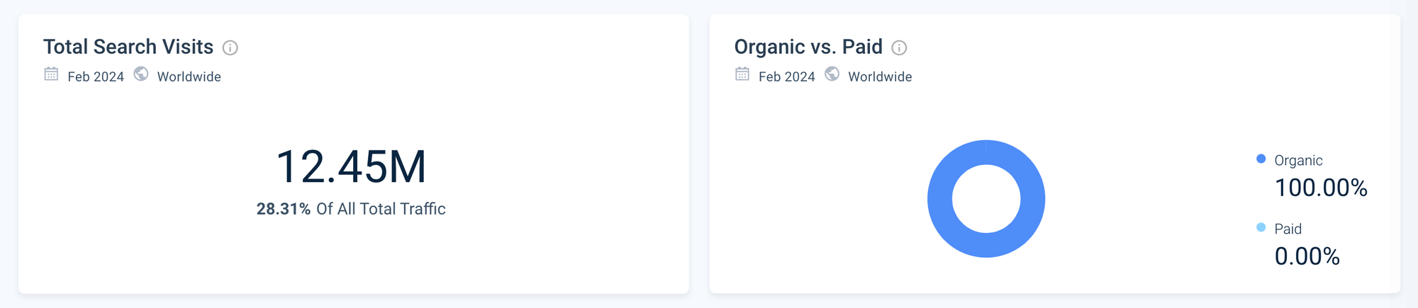 검색 트래픽 전체에서 유기적 검색(Organic)이 100%의 비율로 나타나고 있으며, 유료 검색(Paid)의 비중은 0%로 집계되었다.