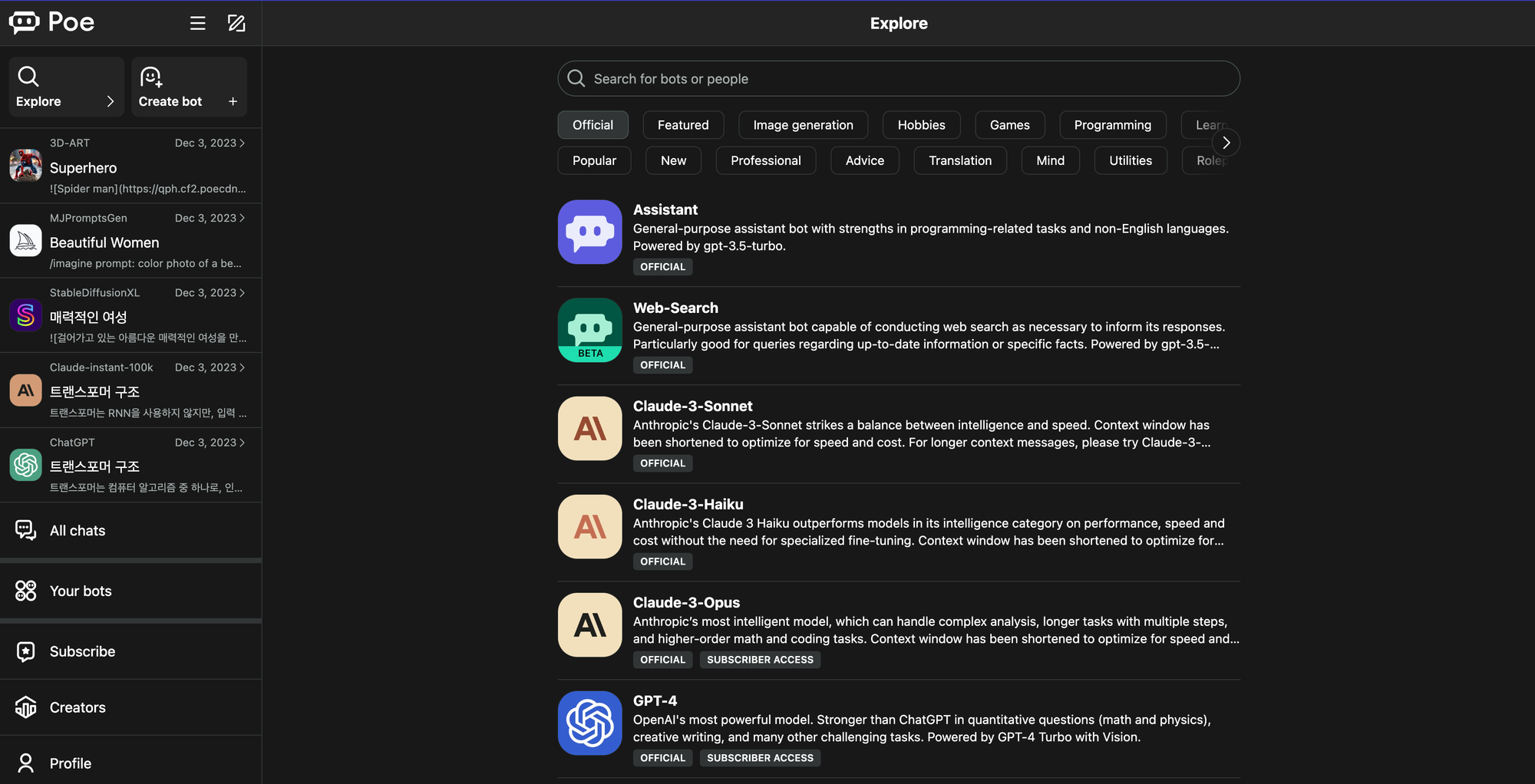 - 유료버전을 사용하면 GPT-4 Turbo, Claude 3 등을 이용할 수 있다.