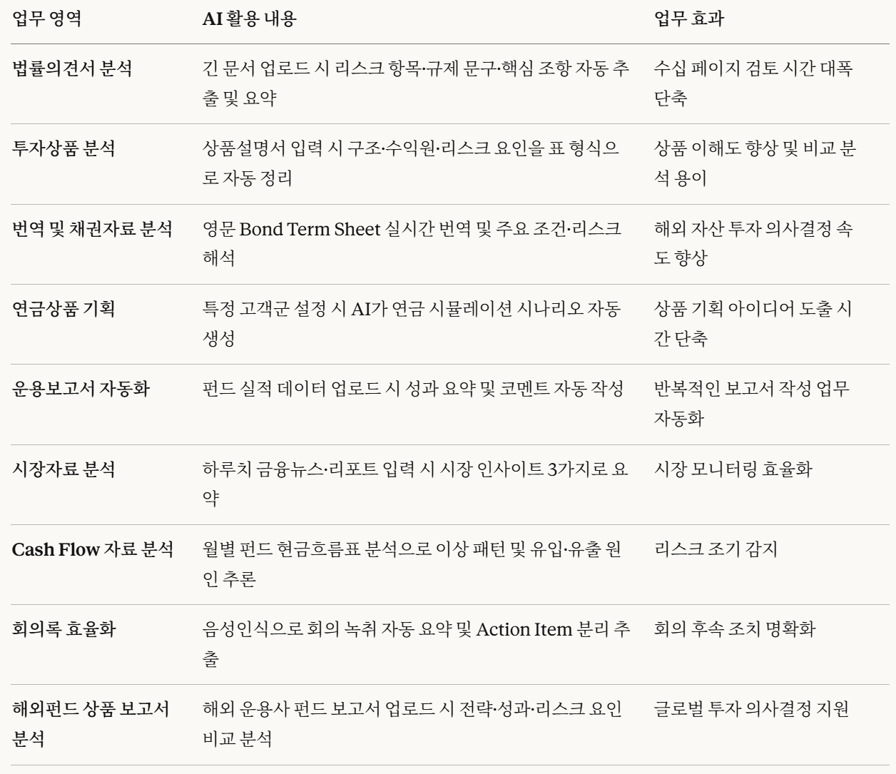 법률의견서, 투자설명서, 운용보고서 등 문서 작업이 많은 업무부터 AI를 적용하면 빠른 성과 확인