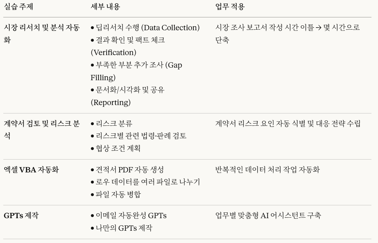- 실습 과정: 5시간 × 3회 - 업무 적용 집중 실습