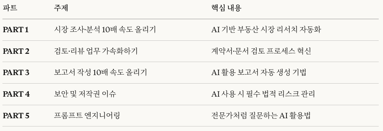 단순한 AI 도구 소개가 아닌, 부동산 금융 실무자가 직면하는 구체적인 업무 시나리오를 중심으로 설계했습니다. 특히 PART 4에서 다룬 보안·저작권 이슈는 금융권 특성상 반드시 짚고 넘어가야 할 필수 과정이었습니다.
