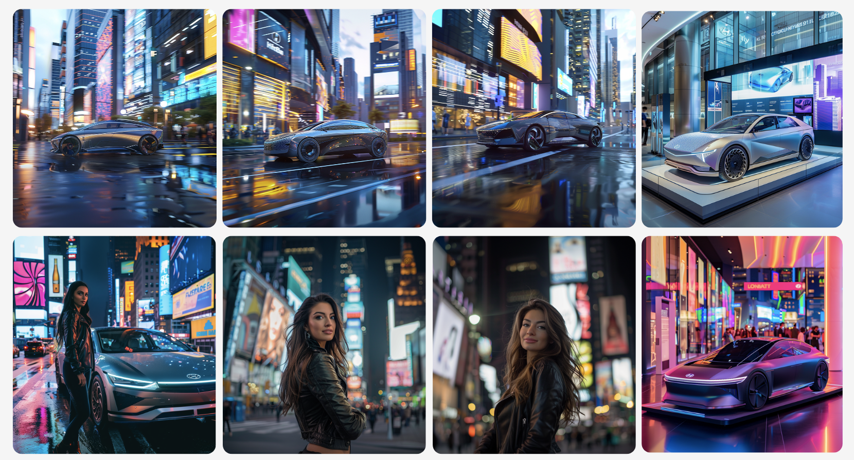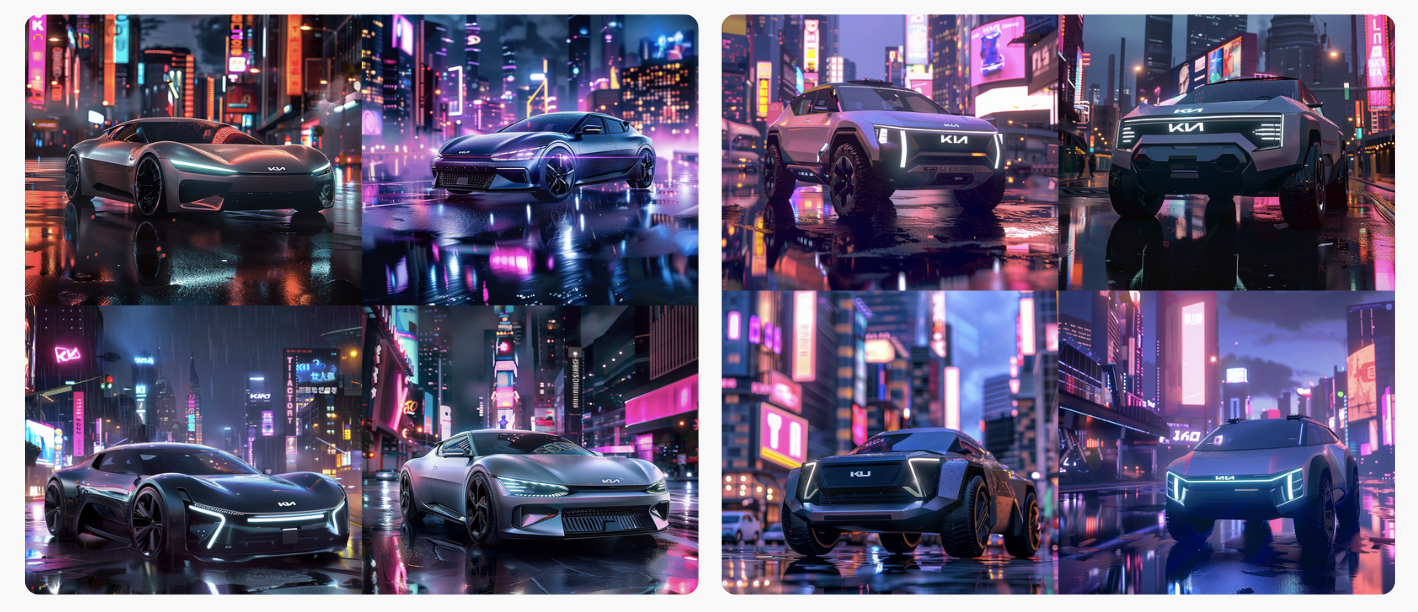 GPTs에서 제공받은 프롬프트를 활용하여 미드저니에서 멋진 결과물들을 만들어냈습니다. 아이오닉의 혁신적인 자동차 컨셉 디자인을 시작으로, 그에 어울리는 광고 모델까지 생성했습니다. 더 나아가 이 모든 요소를 조화롭게 담아낸 전시회 이미지까지 제작하여 완성도 높은 시각적 표현을 이뤄냈습니다.